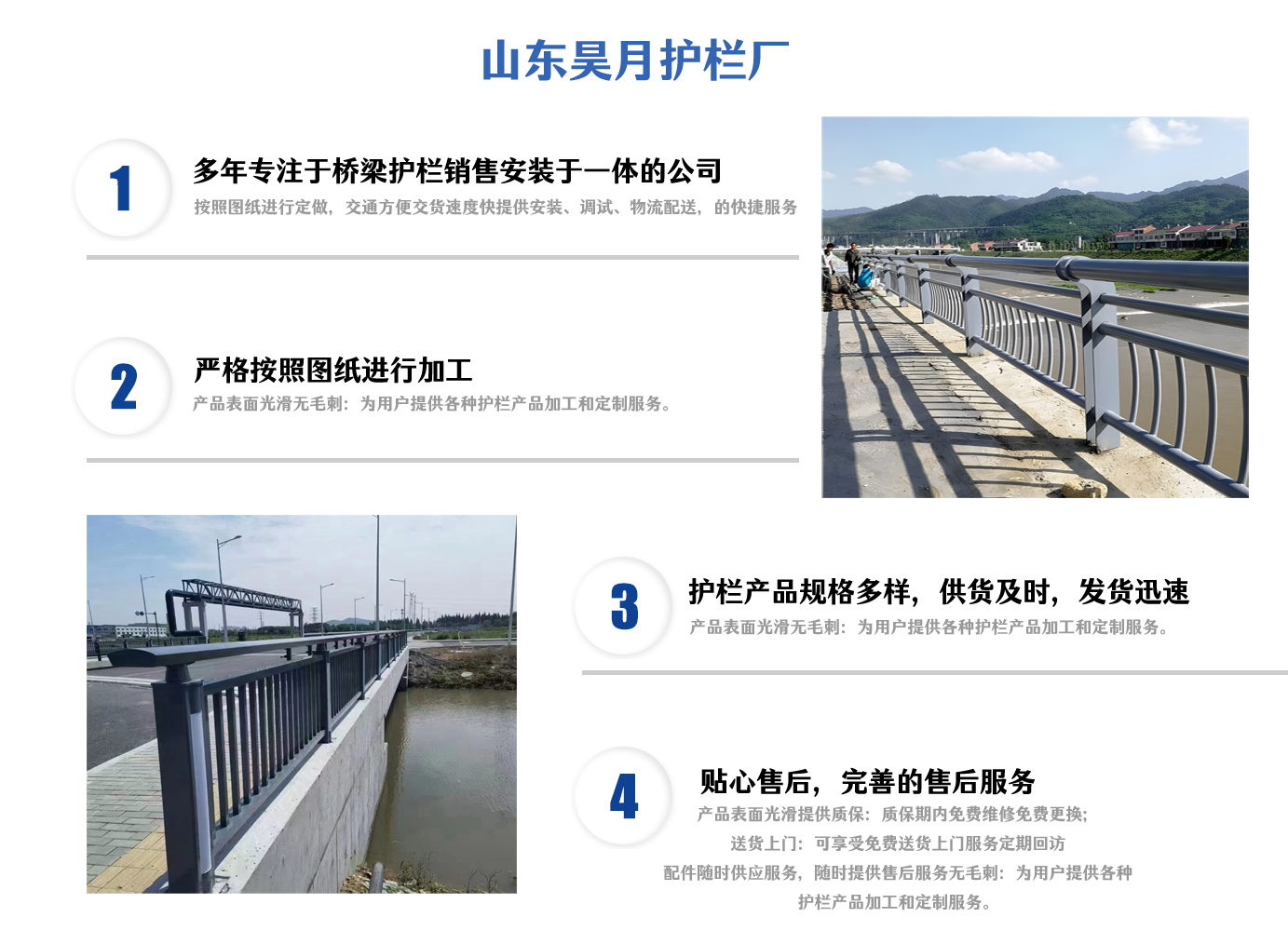 山東昊月金屬制品有限公司坐落于原材料豐富人文和諧交通發(fā)達及有“江北水城”之稱——聊城。 公司以科技興廠為宗旨,積極引進人才和技術,不斷開拓創新. 主營產品:SS級橋梁防撞護欄,不銹鋼復合管護欄,鋁合金護欄,燈光護欄,河道護欄等等。產品本公司建立了一套科學的行之有效的質量體系,擁有一支高技術、高素質團隊,堅持以“誠信”為本,堅持“優(yōu)質的質量、貼心的服務”為崇高理念,為用戶提供質優(yōu)價廉的產品提供至真至誠的服務。與客戶合作雙贏、攜手共創輝煌。 公司以科學的工藝、嚴格的質量管理、完善的服務理念、合理的銷售價格贏得了良好的聲譽,建立了密切和愉快的合作關系。多年來,我們一直以良好的品質、合理的價格,完善的質量保障體系,完善的售后服務為客戶提供周到的服務,滿足廣大客戶的需求。 我們以信譽求生存,以質量去競爭,以真誠換合作,以效益求發(fā)展,是我們的服務宗旨。我們積極主動與同行加強交流與時俱進,邁向新的歷程!我們竭誠歡迎您的咨詢和洽談,愿與同行業的同胞們合作共贏。...